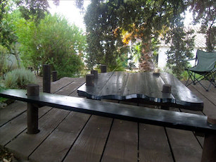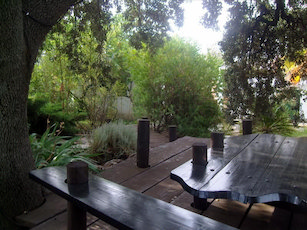 - Decking area under the grand oak tree overlooking the pond and gardens.