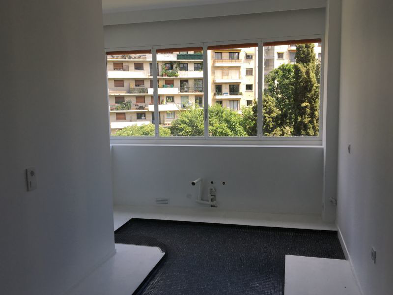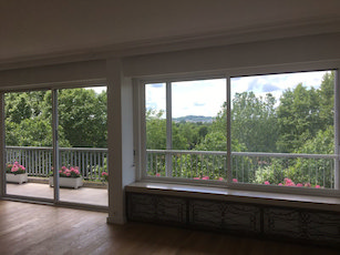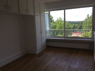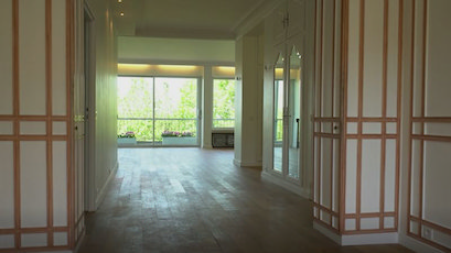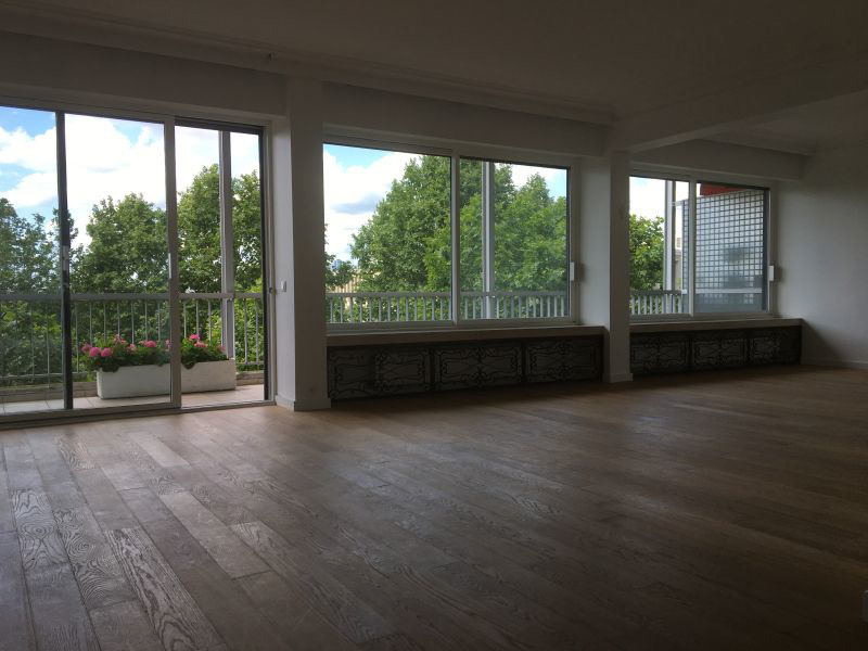 The entrance hall, the sitting and dining area cover 80 m2. The apartment is exceptionally bright and enjoys a panoramic view onto the Mont Valérien, La Défense and the interior garden of the building.