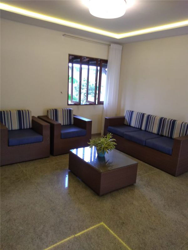 living room: 3 seater settee, 2 armchairs and 2 benches.