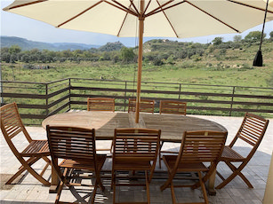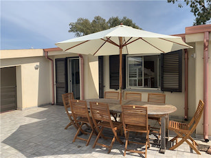 • Exterior: large wooden extendable table and chairs for 8/10 people, sofa and 2 arm chairs (in same teak wood as table), swinging sofa