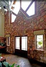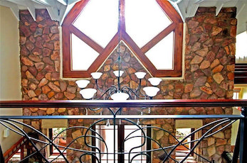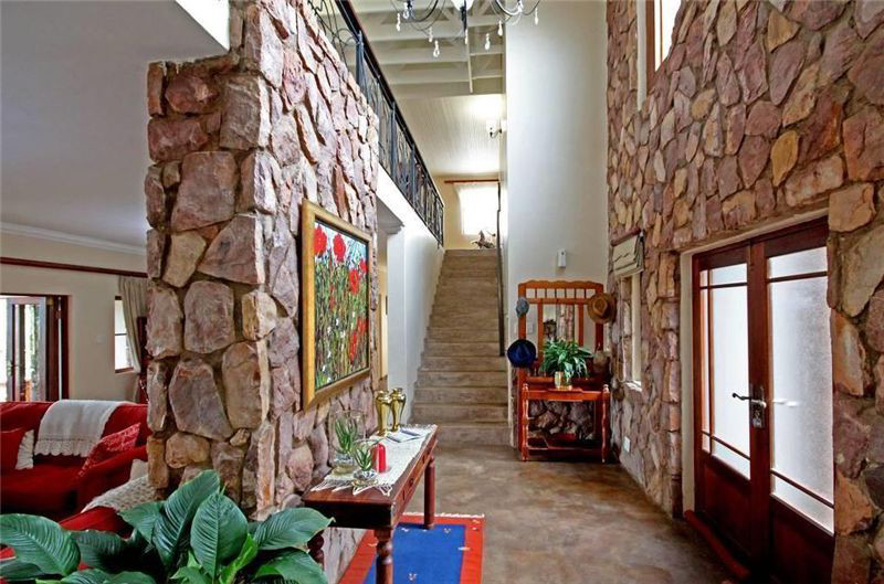 The downstairs area consists of a stunning entrance hall with rock finish and chandelier leading to a large lounge with gas fireplace for those cold misty evenings.