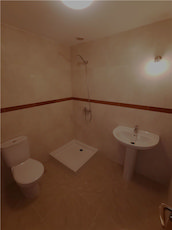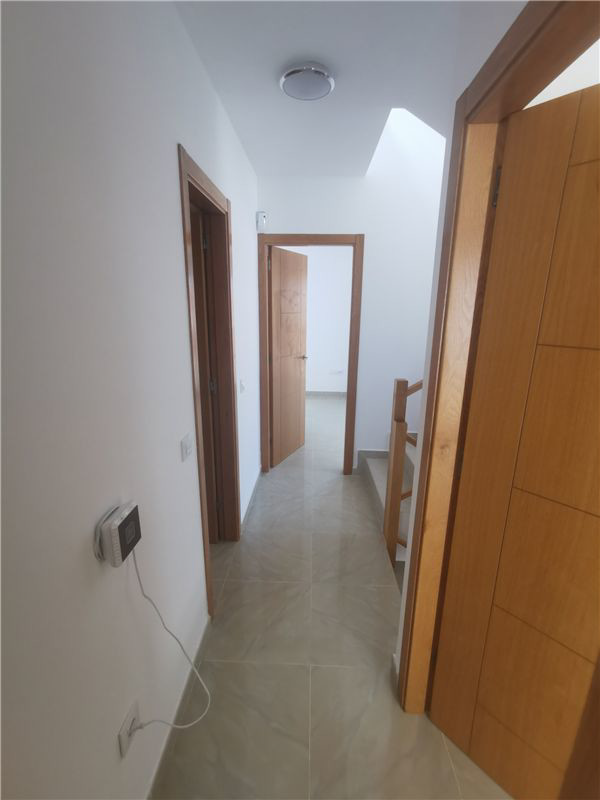 • First floor: Large master bedroom with en suite bathroom (shower cubicle) and private balcony. Large family bathroom (with bathtub and shower fittings). Second double bedroom and third double bedroom with sliding doors to a large, private terrace behind the house.