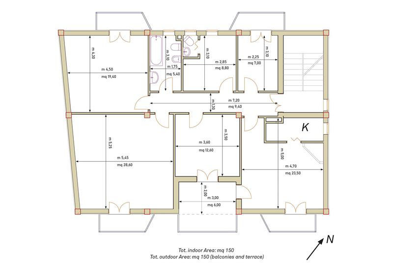 Spacious apartment on the 2nd floor of a building open on 4 sides, with an entire roof terrace that offers a panoramic view of the sea, surrounding village and hills. The surface (132 sqm), includes 1 bright dining room with a beautiful and well-functioning corner fireplace, 1 small kitchen, 1 large bathroom with bathtub and 1 smaller double bathroom, a large living room, 2 spacious bedrooms and 2 adjoining smaller bedrooms that could be combined into a large single room.The large roof terrace (132 sqm) is flanked by a small space on top of the stairs (20 sqm) that could be turned into an attic and equipped with a wooden pergola. The beautiful view of the sea and village can also be enjoyed from the veranda and 5 balconies which have a total area of 20 sqm.