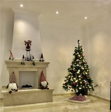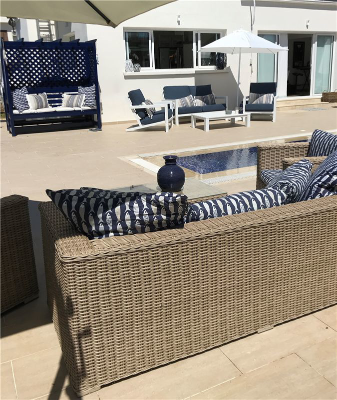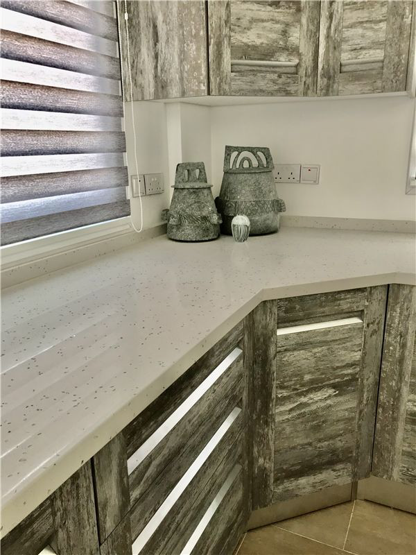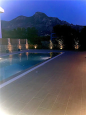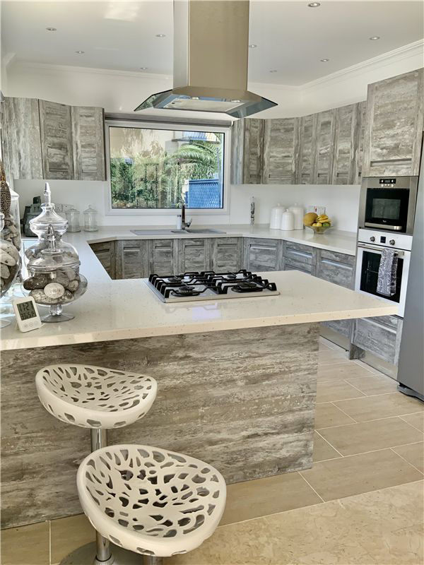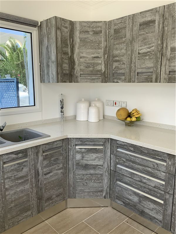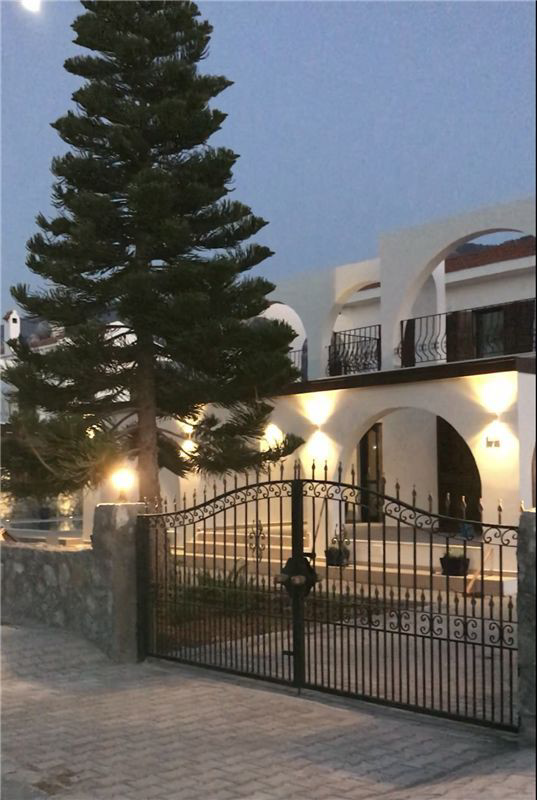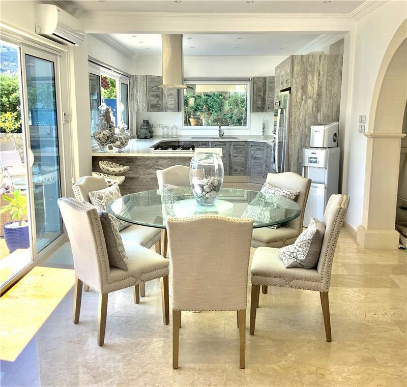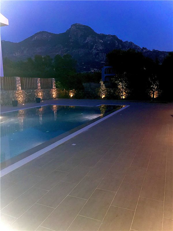This luxury villa in the highly desirable district of Karsiyaka, Kyrenia, is beautifully presented and offers a generous 200 sqm of living space. The property comprises 3 bedrooms, each equipped with inverter AC units, and 3 bathrooms, providing ample space for comfort. The reception room, with its marble and chiselled travertine flooring from Izmir, leads to a bespoke designer kitchen fitted with quartz worktops and integrated appliances.The villa is situated on 800 sqm of land, featuring mature gardens with manicured lawns and a variety of fruit trees. The exterior also boasts a double garage and a stunning overflow 10 X 5 m glass mosaic pool, surrounded by vast pool and roof terraces that offer breathtaking mountain views. The property benefits from gas central heating powered by a new Bosch boiler.