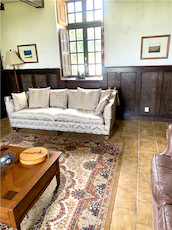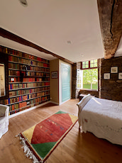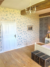 Also in the entrance hallway on the ground floor there’s a cloakroom toilet and washand basin under the staircase and a door leading to the rear garden. To the right (east wing) you have a beautiful dining room featuring a huge granite open fireplace and large oak beams . There are large windows north and south with original internal wooden shutters letting in lots of natural light . Leading from the dining room is a beautifully presented lounge/drawing room with oak paneling and a fantastic wood burner. Along the main wall there are original built in cupboards and a clever slide out bar shelf . The south facing window has internal wooden shutters and on the north wall you have double doors leading to the rear garden ,with views over the rolling countryside. On the ground floor west wing you have a library/reading room leading to a utility/laundry room behind and straight on a huge kitchen /living area with a large canopy fireplace . It features a fully fitted german kitchen with granite worktops and integrated appliances (fridge, freezer, dishwasher ,oven and microwave) it has full height slideout larder cupboards. It also has two separate sinks cut into the granite countertops making it a great place to cook and entertain. There are also double doors leading out onto the south facing front garden for those warm summer days . The Manor also benefits from super thick walls ensuring a cool night's sleep on hot summer nights.