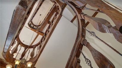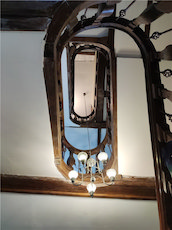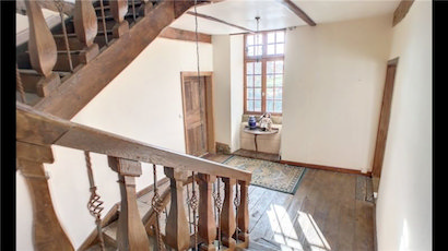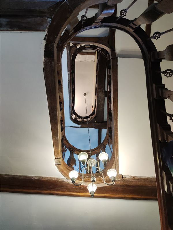 As you enter the Manor you are greeted by the amazing oak staircase which divides the east wing and the west wing . The staircase spirals all the way to the second floor , giving the wow factor