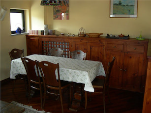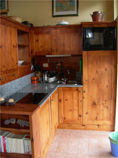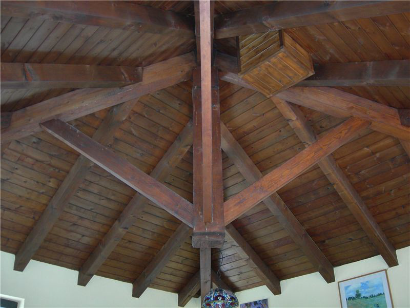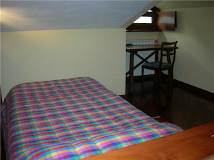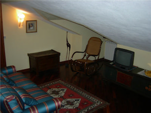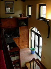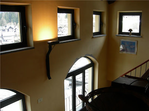 A comfortable staircase connects the two floors, with a small but well-equipped cooking area at mid-level, lit by large arched windows; the living room and the dining room are located in the impressive tower, characterized by a gorgeous exposed-beam ceiling; the view from the 12 small windows extends in all directions.