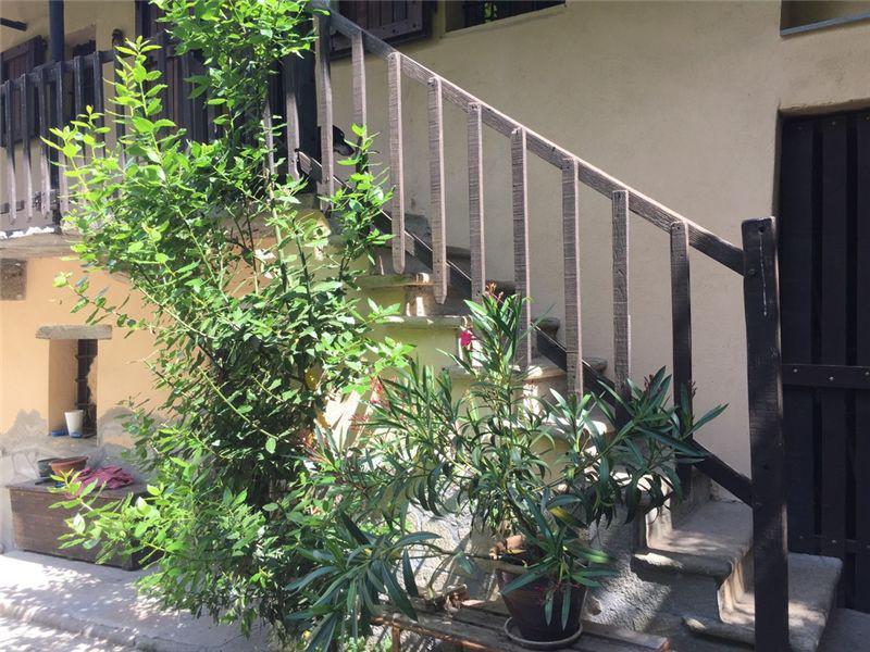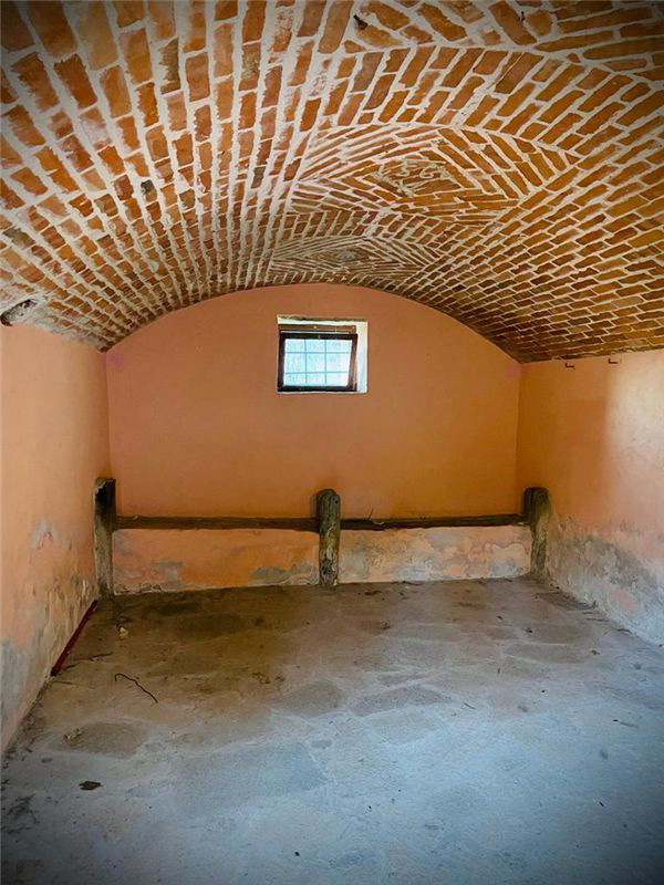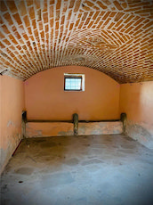 Ground floor : utility room with large chest freezer, various shelves and tables for storage and stone paved floor; next to that room is a ‘taverna’ with a beautiful vaulted brick ceiling and stone paved floor; next to that is a bedroom with woodburner (for winter) and en-suite shower room with toilet and sink and plumbing for washing machine – fully tiled ceramic floors. There is a garage/large open storage area at the end of the house.