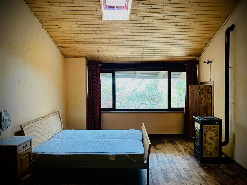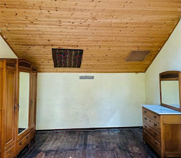 The large main bedroom has high ceiling, with skylight and large double glazed windows, wood floor and a second wood pellet stove. This room has a large wardrobe, chest of drawers with marble top, matching bedside table, art deco wall lights and a super-king double bed with adjustable slatted base with wicker head a foot end.
