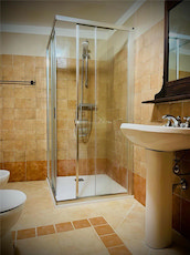 From the living room is a study/bedroom with wood floor and door to balcony. There is a roof/loft inspection hatch in this room. Another door leads to fully tiled bathroom with large newly installed shower, electric radiator, bidet, washbasin and toilet, storage shelves window with outside shutter.