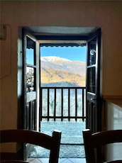 Stone stairs lead up to the balcony and main living area. There is a fully fitted kitchen with fridge freezer, dishwasher, gas boiler, gas hob, electric oven, fitted cupboards and dining table and chairs. Double doors that open onto a small balcony that overlooks the whole panorama of the town below and the mountains. Ceramic tiled floor. Full triple glazed door to the main balcony and two triple glazed windows.