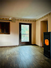 From the kitchen door to living room with double windows and triple glass door to balcony. Recently installed wood pellet stove, wooden block floor, sofa bed.