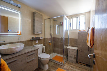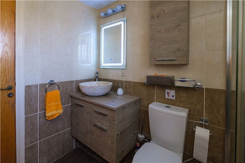 The modern newly refurbished family shower room, consists of a wash hand basin with spacious under cupboards, wc and a built in shower cubicle.