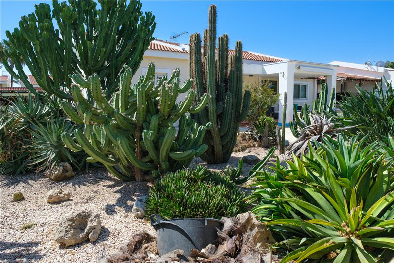Flowering cacti and many succulents are generously planted in this easy to maintain garden.