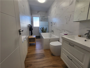 Leading off of the hallway as well are all the bedrooms of the property. In total there are four, all of which are comfortable and spacious doubles with large wardrobes. There are also two fantastic modern bathrooms, the largest of which is equipped with both a bathtub and a shower, whereas the smaller bathroom is equipped with a shower. The entire property also benefits from diesel central heating, there is also a pellet burner in the entrance hall for supplemental heating.