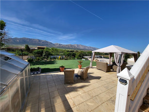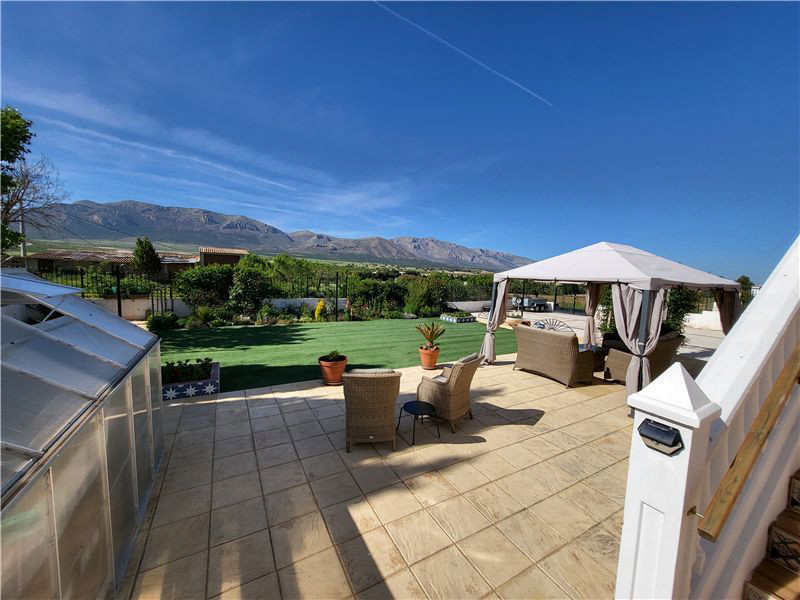 The main garden area is vast and offers plenty of space to enjoy various activities. A large patio area with a pergola offers great outdoor living and dining space, making the most of the incredible views of the mountains and valley. To one side of the villa, there are small plots on different tiers for growing your own vegetables. Around the edges of the plot are garden areas with various plants and flowers. On the opposite side of the villa is a vast parking area, accessed via a driveway that leads down the side of the property, but also with further access out onto a track to the side of the property. It's also from this garden area that you can find the door leading into the huge basement area, divided into numerous rooms and making for great amounts of storage space. There is also an immense garage, large enough for up to 4 cars.