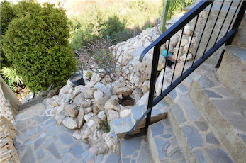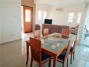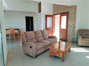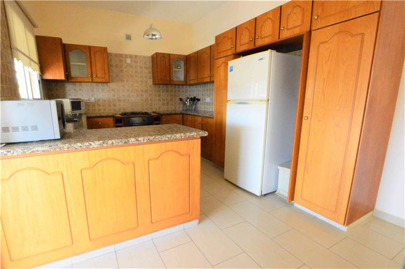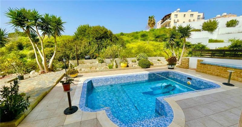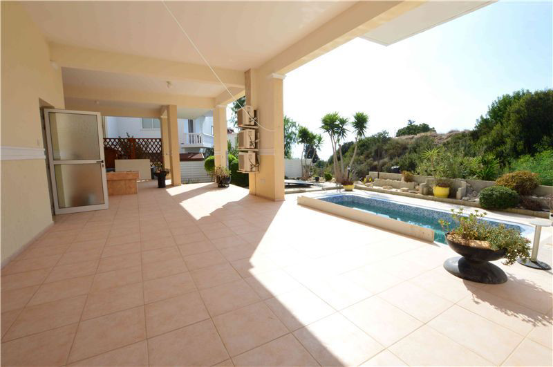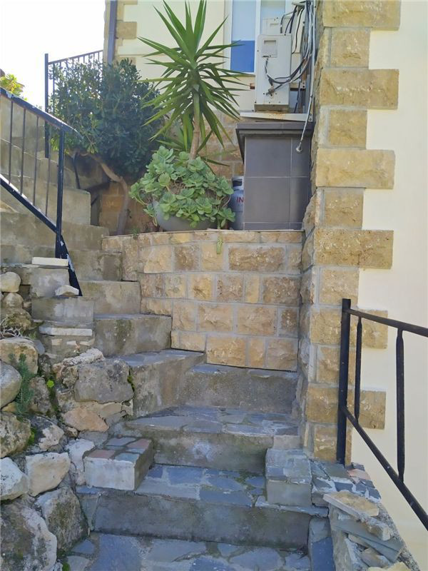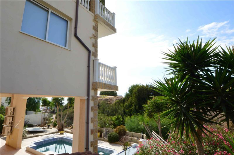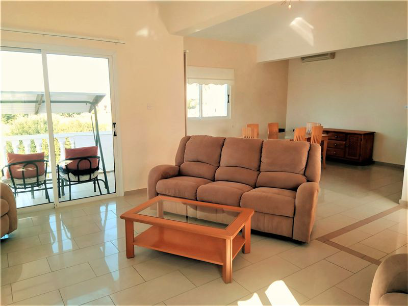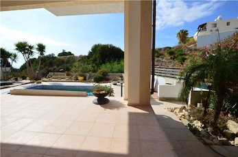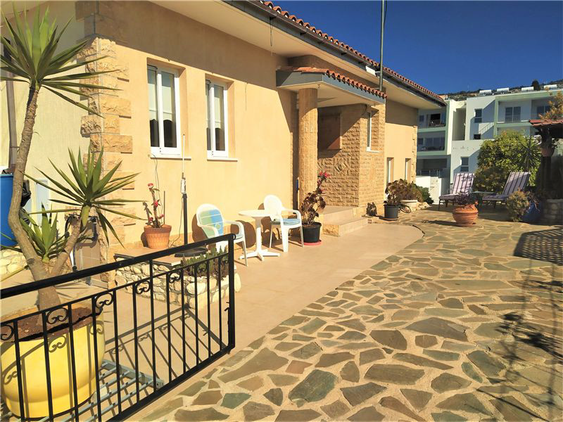 This stunning three bedroom villa which is maintained to highest standards, is located in lower Peyia (Pegeia to the locals) and is within walking distance to all amenities. It is away from traffic and noise and forms part of a small development of four villas, situated in a small, quiet cul-de-sac.The villa is on three levels - lounge/diner and kitchen on the top level to take advantage of the views, bedroom level one floor down (cooler for sleeping) and basement area on the lowest level. The villa has a generous driveway to park three or four cars. There is also a covered car port with tile effect roof. The porch is extremely attractive and is faced with beautiful stone work. Entrance to the villa is accessed through double wooden doors, leading into a large and spacious open plan lounge and dining area. Patio doors in the living and dining area lead out to a large veranda, with views out to the sea and mountains. All verandas have attractive balustrade.