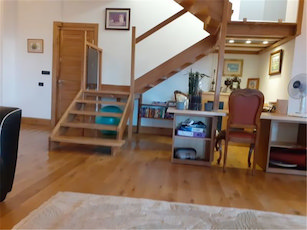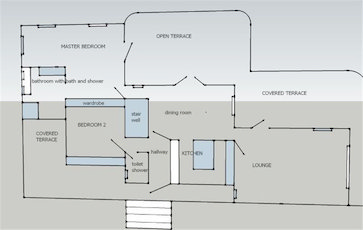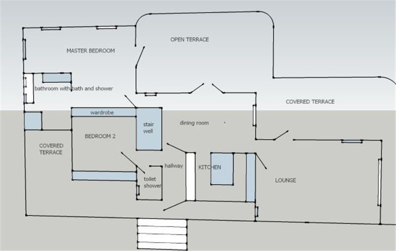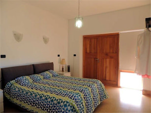The villa sits over two levels The main accommodation is on the upper level accessed by 6 steps that lead to the main glazed rear door. Internally the two levels are serviced by a generously proportioned central wooden staircase. Entering the rear door leads to a hallway which itself gives access to a large guest bedroom, bathroom (complete with toilet and shower), ground floor access staircase and the dining room.