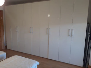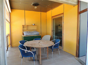 This first guest bedroom has a full wall of fitted wardrobes and a fully glazed door that opens out onto a covered terrace area. This terrace area has 2 ceiling to floor clear exterior blinds that can be dropped to offer year-round alfresco dining.
