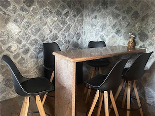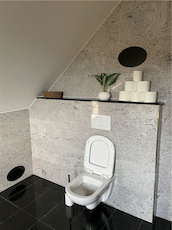 The interior is beautifully furnished with natural stone in a black and gold combination. Ground floor: