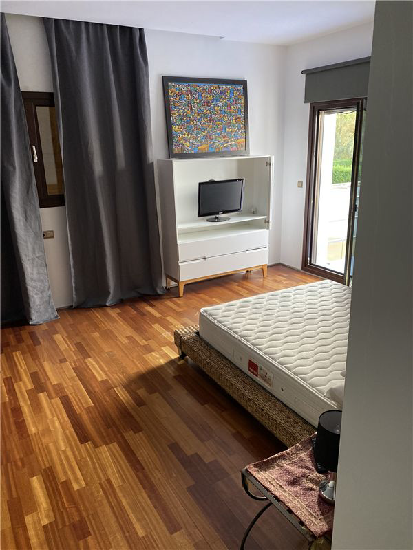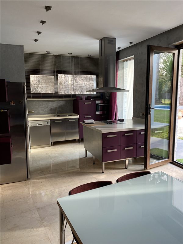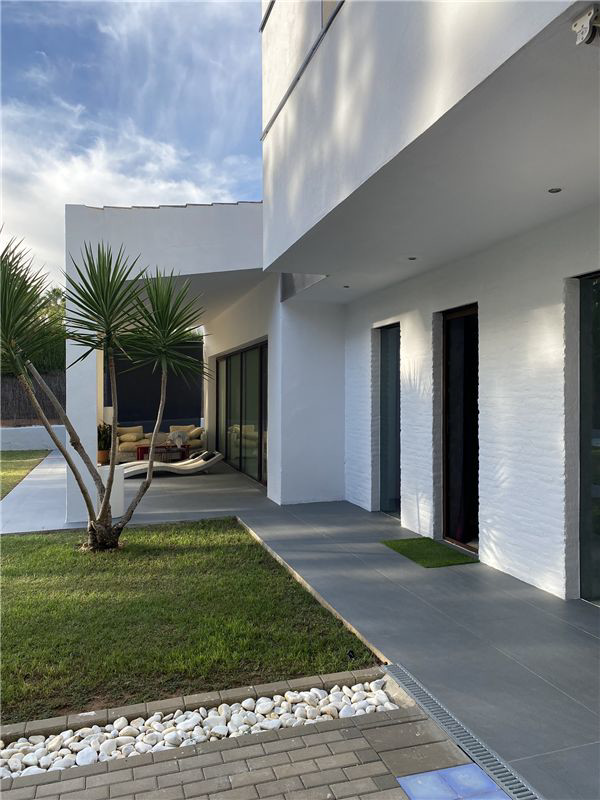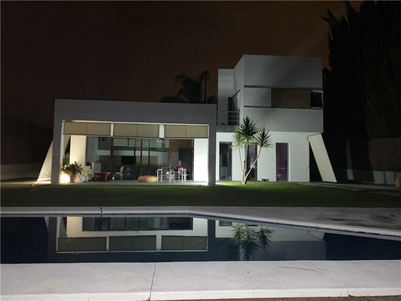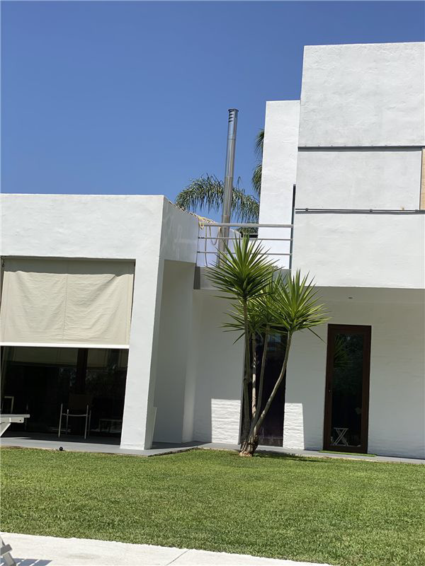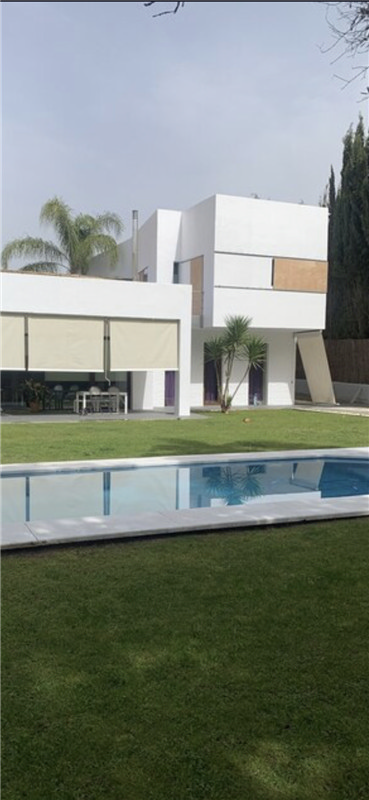 Totally renovated in 2021 this luxury villa sits on a private 1200 m2 plot, situated to benefit spectacular views of Las Minas Golf course. The villa provides accommodation of 3 en-suite bedrooms, a large contemporary open plan kitchen dining room and sitting area, a double-height sitting room, a study, and excellent outdoor facilities. It is located on a very private street on the way to the Horse Club . The front of the house is accessed from the road along a sealed drive and leads to the entrance hall. The ground floor comprises of one en-suite bedrooms, a large drawing panoramic room, a dining room, and an ample fully furnished kitchen. The spacious master suite (50m2) with its bathroom, walking in wardrobe/dressing room, a drawing room and the terrace with views over the gold course and a really spacious room (35m2) with its wonderful WC are located on the lower floor. A large terrace feeds off the drawing-room towards the salt water swimming pool and a lovely barbecue area ideal for entertaining. A modern Bodart et Gonay Fireplace cassette is installed in the heart of the house . Air-conditioning in all bedrooms – Private space for up to 5 cars. The villa is 370m2 built plus outdoor terraces.Other outstanding features of this villa are the large central staircase with space for a hydraulic lift, air conditioning, alarm, automatic sprinkler irrigation, fitted wardrobes in all bedrooms, pre-installation of solar panels, illuminated garden, as well as the salt water swimming pool.