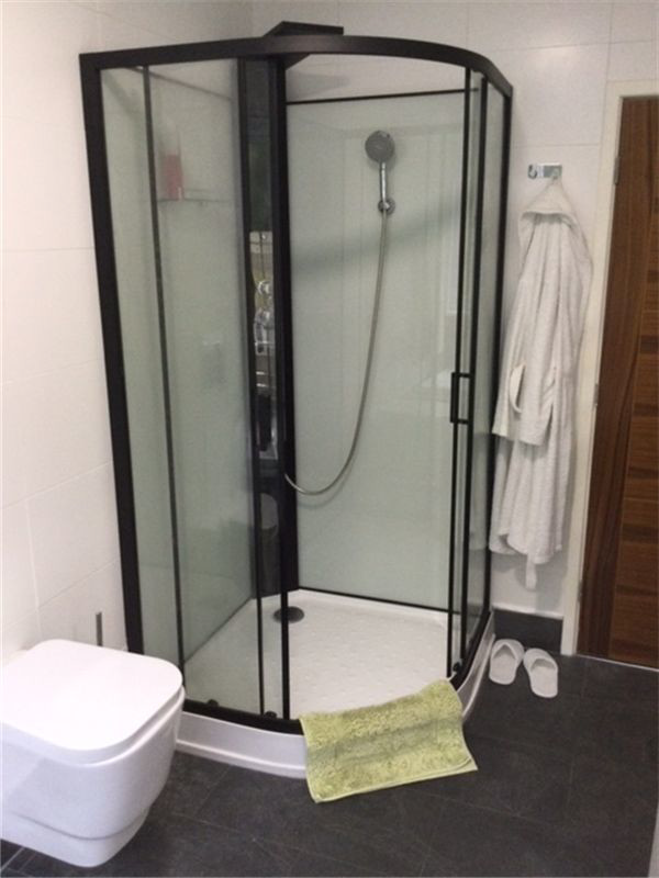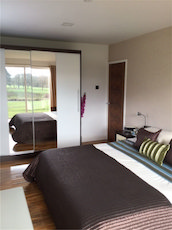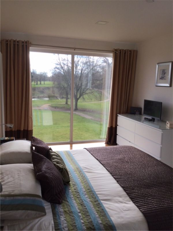 The MASTER BEDROOM is a dual-aspect, double-bedded room with a stunning Glass Wall which again gives open views across the golf course and Burbage Common, as well as a further window giving views of the gardens to the side. There is a suede-effect feature wall, built-in wardrobe and plenty of space for further storage.