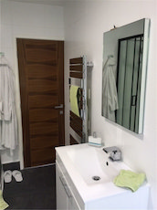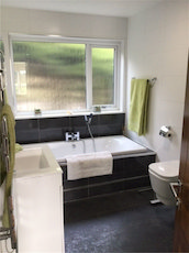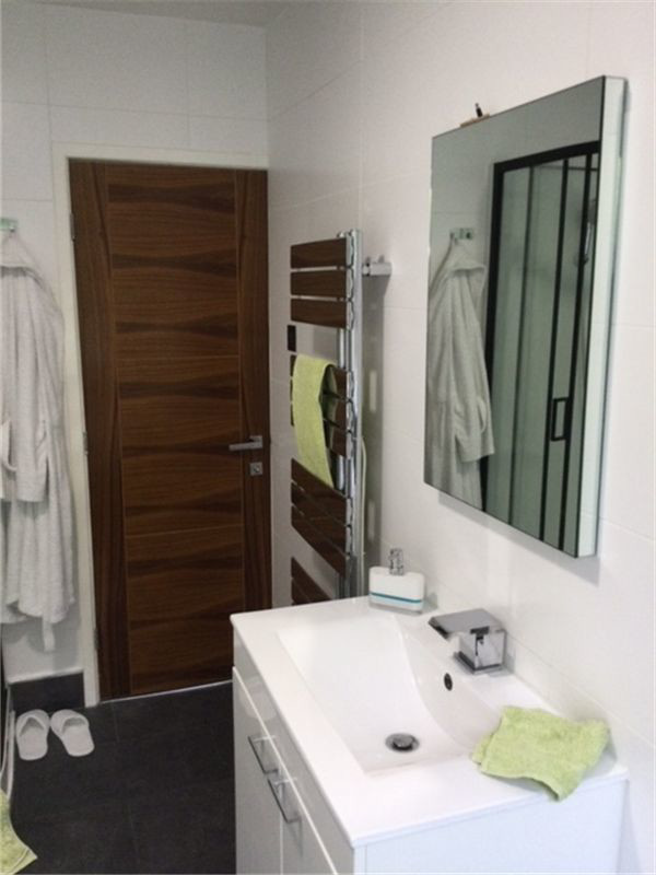 The BATHROOM, situated adjacent to Bedroom 2, has slate-tile effect flooring, a double-ended Bath, separate walk-in Shower, wall hung WC, white sink Vanity Unit and heated Towel Rail.