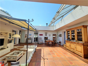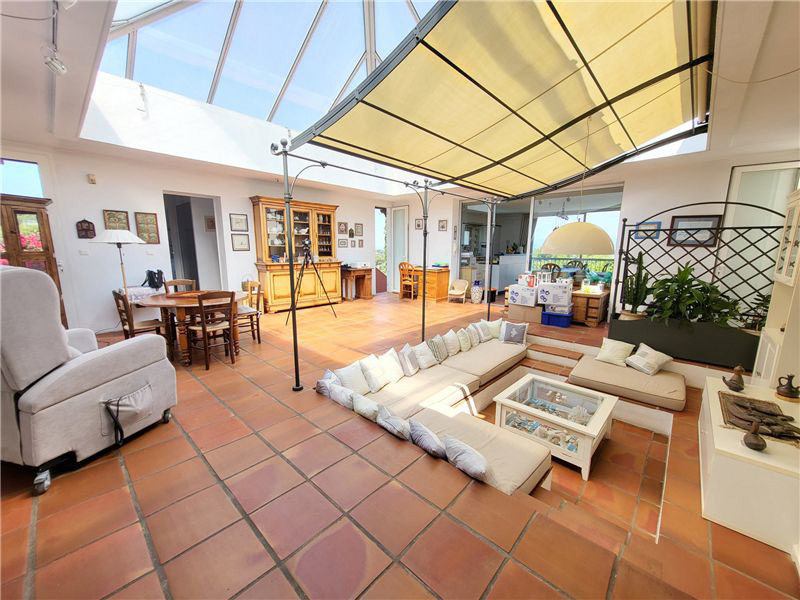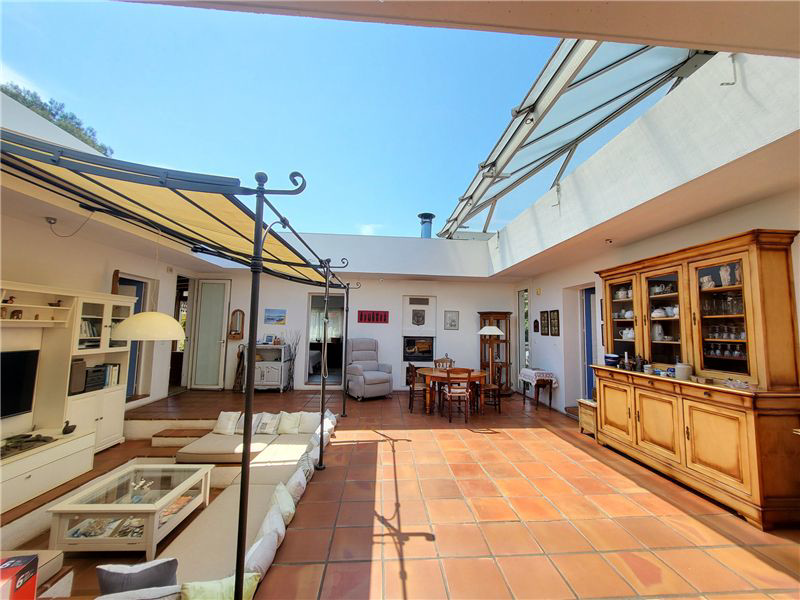 The living room, a spacious atrium of over 50m2, is a testament to architectural brilliance. A charming fireplace creates a cosy atmosphere during cooler months, while a remarkable transparent pyramidal roof floods the area with abundant natural light and offers a unique viewpoint to the azure sky above.