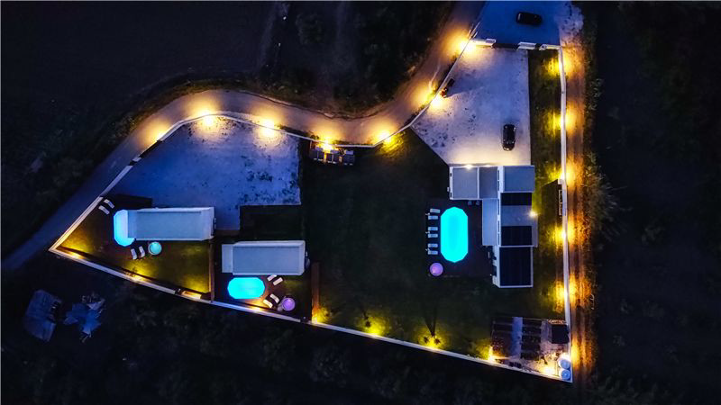 Everything is electronically controlled from the smart phone and the wooden framed houses are free of humidity, soundproof, ecological and energy sufficient as the electricity is provided with solar panels. Each house is very private and is equipped with a Jacuzzi and pool. The biological garden provides vegetables, is equipped with agriculture water and the selling price includes all garden equipment including a small tractor.