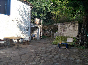 Outside steps lead down to the patio, kitchen, bedroom 3 and a small covered hallway with space for a table when it’s too hot outside. The patio is paved, with two ancient mulberry trees, an old bread oven (needs repair) and seating area. This is where we eat in the summer, with shade from the trees and views towards Kalamata and the bay. The shower and toilet (loo with a view!) are in a separate building at the end of the terrace. There is an olive tree, two citrus trees and another mulberry tree on the terrace. Adjoining the house is a concrete water tank, no longer in use since mains water was installed, but perhaps useful for irrigation. There is a further very small terrace a little higher, with another old water tank.