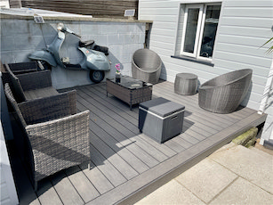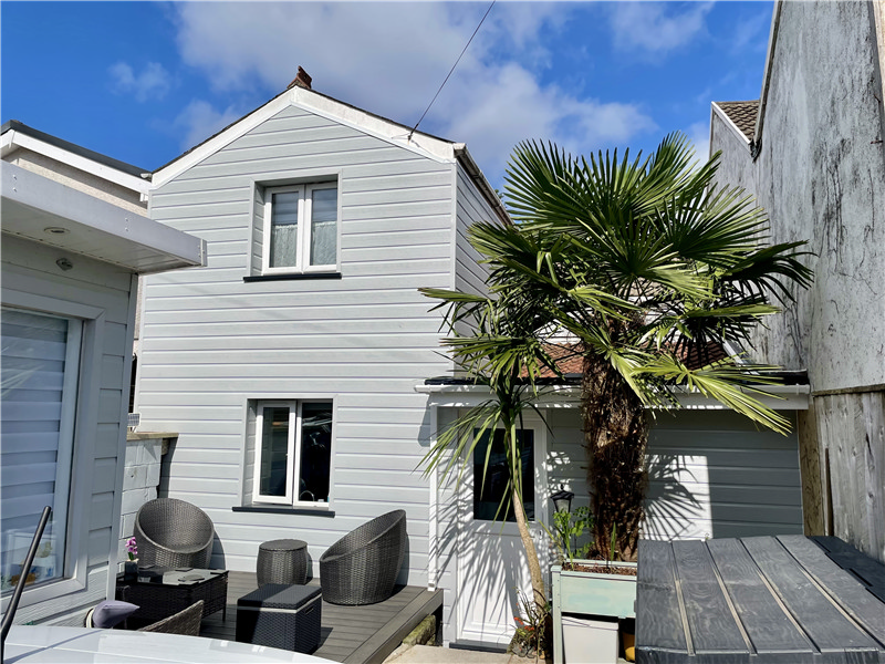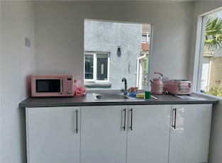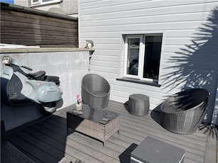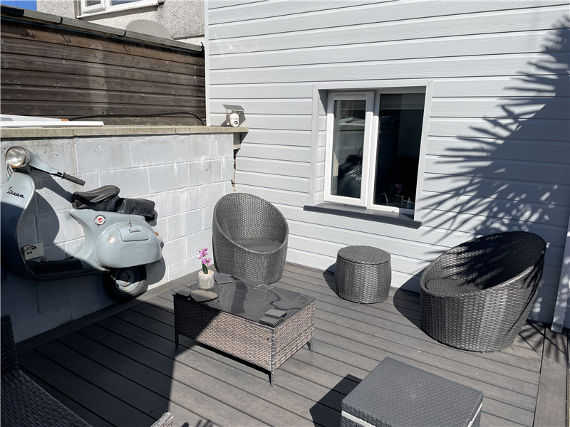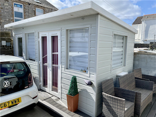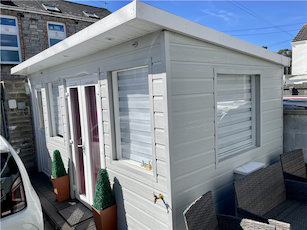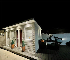 Outside rear paved hard standing for vehicle, Outbuilding/ Office / Studio with kitchen area including Store Room Decked Area, rear access private electric shutter with automatic opening and shut.