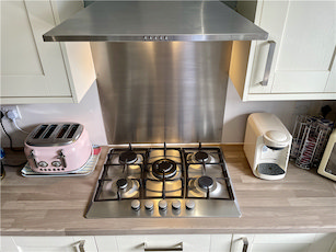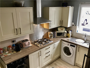 Kitchen/Diner with Fitted modern light cream units, gas hob, electric oven, cooker extractor hood. Plumbing for automatic washing machine. Splash proof laminate floor, flat ceiling with spot lights.
