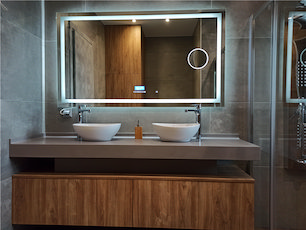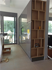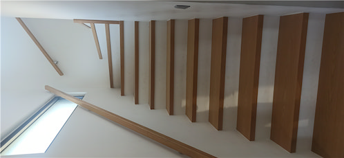 The bathroom features a walk-in shower, a Grohe toilet tank, branded sanitary items, a Corian countertop with double sinks, Italian storage furniture, a washer-dryer, Italian fixtures, and a smart bathroom mirror with a heated glass, weather station, and Bluetooth connectivity to enjoy your favorite music in the bathroom. There is a 200-liter solar water heater, Italian built-in wardrobes in each bedroom, and an alarm pre-installation throughout. The residence remains warm in winter and cool in summer with minimal expenses (utility bills available), and there is also provision for a fireplace if desired. The staircase has an oak finish, gypsum board, ceiling lighting, step lighting, and many other features.