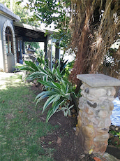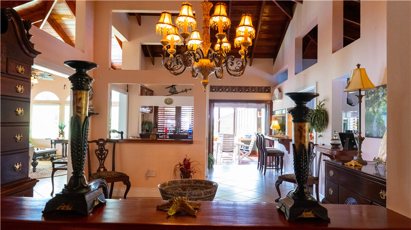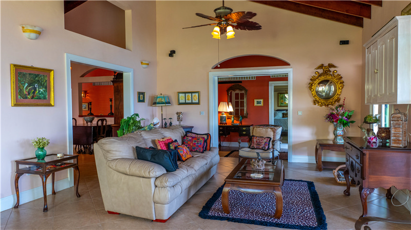 The house is surrounded with three covered decks and extensive lawns, with many mature tropical fruit bearing trees including banana, citrus, and pomegranate.