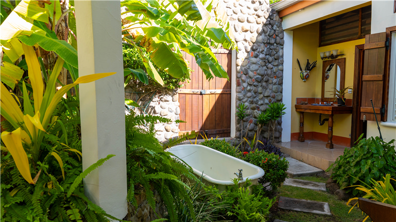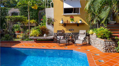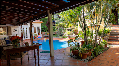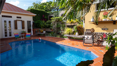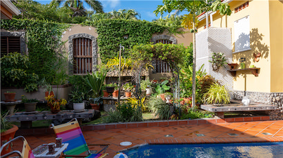 The courtyard discreetly conceals the Pool from the street, and passersby tucked behind heavy tropical wooden garden gates & doors and framed by lush landscaping.
