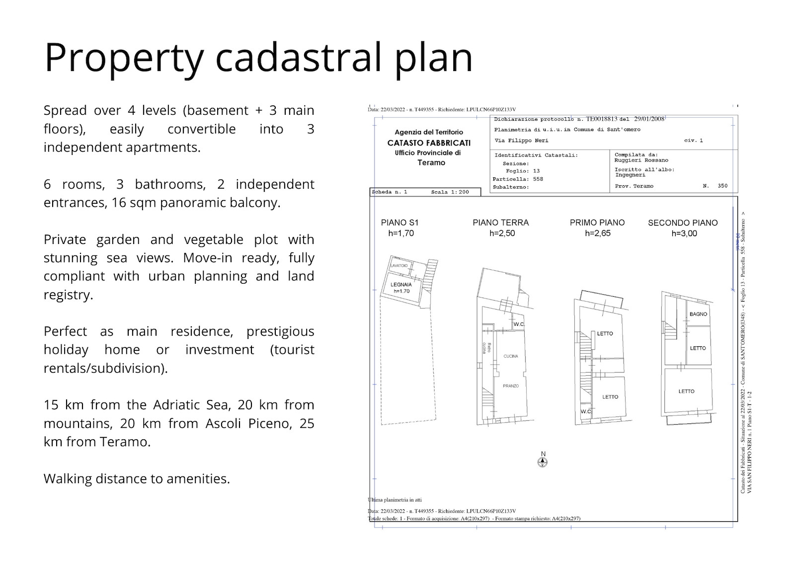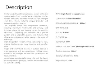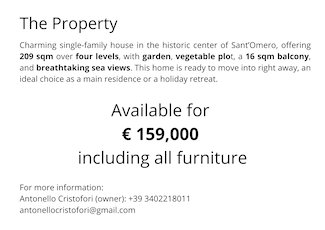 Charming single-family house in the historic center of Sant’Omero, offering 209 sqm over four levels, with garden, vegetable plot, a 16 sqm balcony, and breathtaking sea views. This home is ready to move into right away, an ideal choice as a main residence or a holiday retreat.