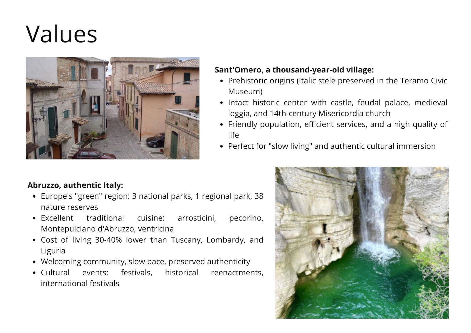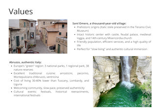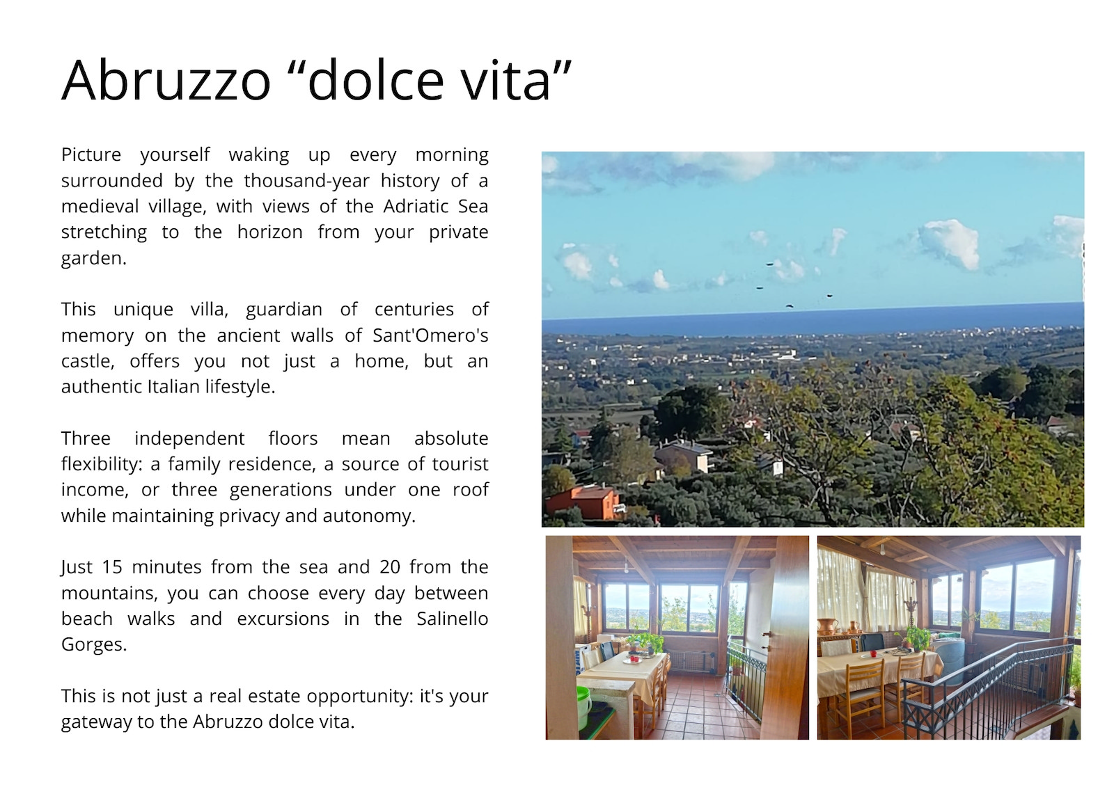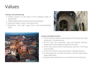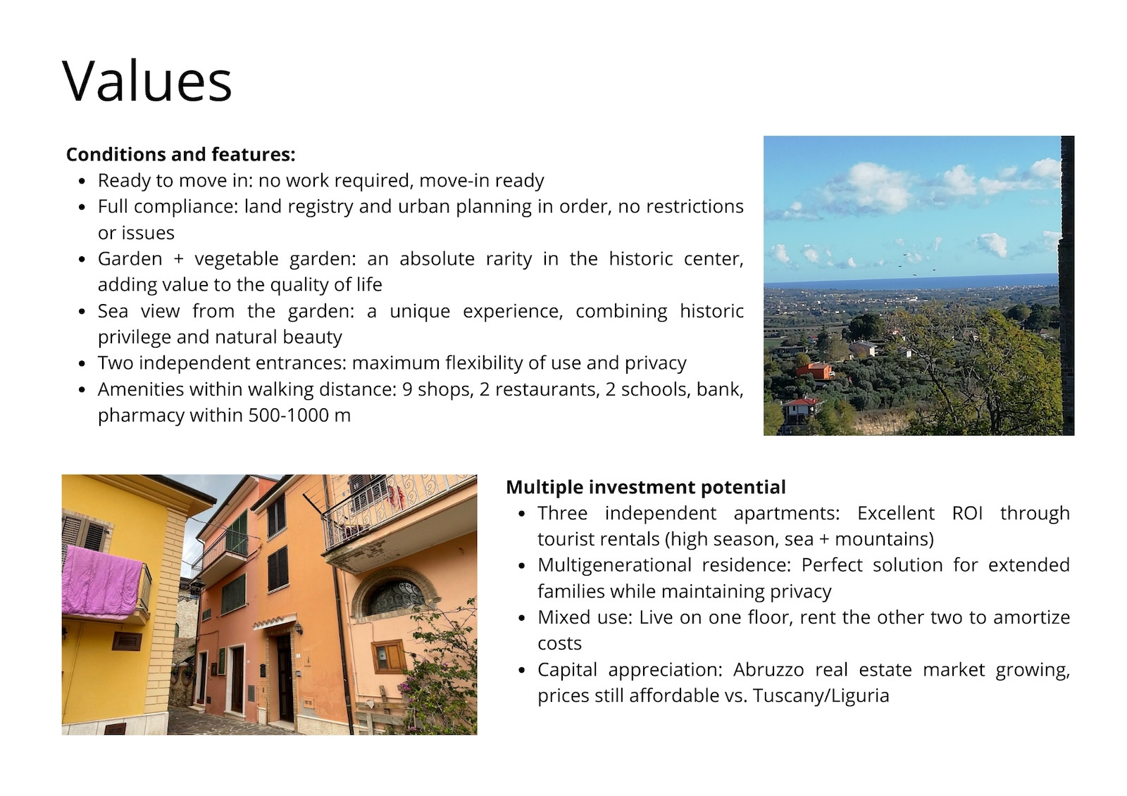 - Capital appreciation: Abruzzo real estate market growing, prices still affordable vs. Tuscany/Liguria