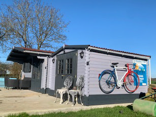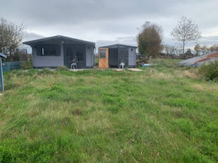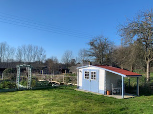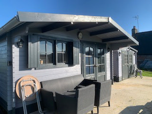 Garden buildings consisting of: 4m x 5m high quality cabin with canopy, double doors, opening windows to front and side with shutters. On a large concrete base with Patio/BBQ area.