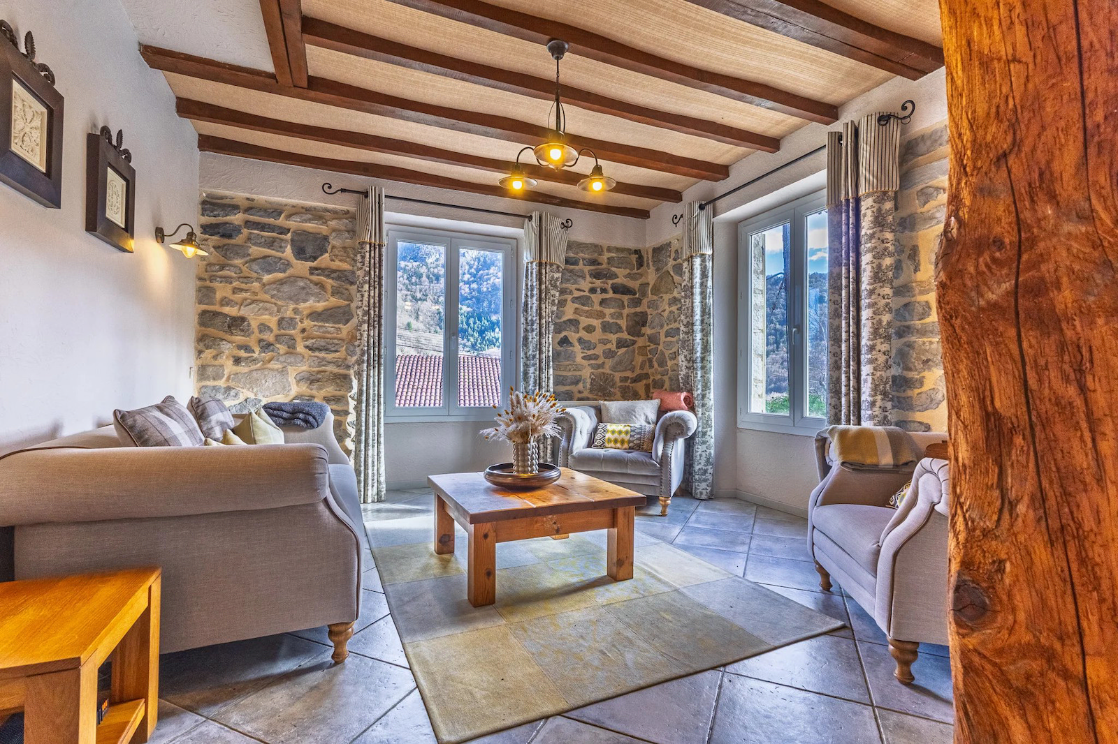 • Spacious living areas with exposed stone, beams & wood-burning stove