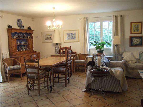 Two large double gates and one personnel gate allow access to the property which is totally fenced or walled, so children and pets are completely safe. The garage has a small side room; the whole is used as a store shed and measures around 20 m². In addition there is parking for at least three cars in the yard. On one side of the property there is a garden used until recently as a vegetable plot, the rest of the garden is planted to give both sunshine and shade, with paved and gravelled terraces here and there. A raised flower bed at the other end of the garden has been planted with beautiful roses and other plants. Behind the garden runs a small usually dry stream, full of frogs in the spring!