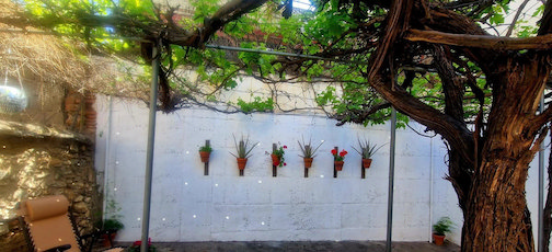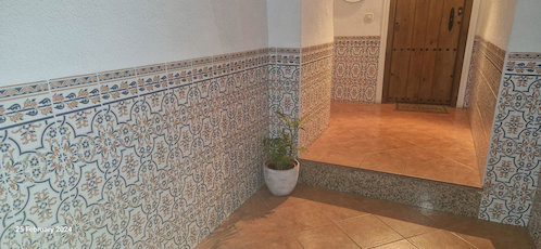 **the door of ground floor 2 bedroom apartment. Beautifully created with rustic terracotta stone floor tiles, raised kitchen with rustic arch having quality kitchen units and marble worktops, log burner and huge apex roof. The large cellar which can be used as a further lounge/bedroom leads off the kitchen, an office leads off the dining area and a cloakroom. The further entrance hall leads to the 2 en-suite bedrooms, one with a walk in wardrobe/dressing room. The bedrooms overlook the back of the property where there is a back door to outdoor area with a utility room/workshop with washing machine, electric lights and shelving. A further outdoor room and a gate leading to a beautiful patio and seating area with vines.