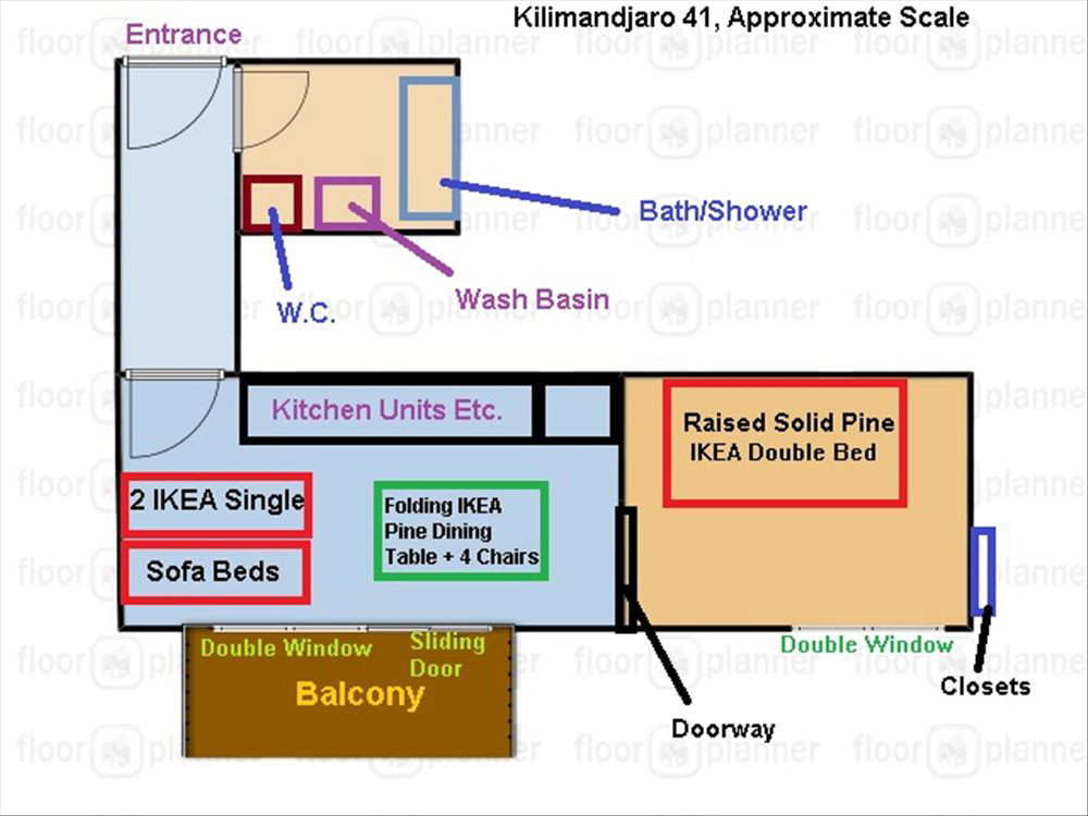 Furniture:IKEA: Raised Pine Double Bed, 2 Single Sofa Beds, and Large Solid Pine Folding Dining Table and 4 chairs. Fridge, cooker, and TV.