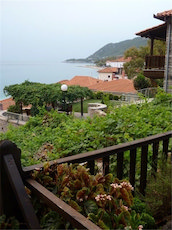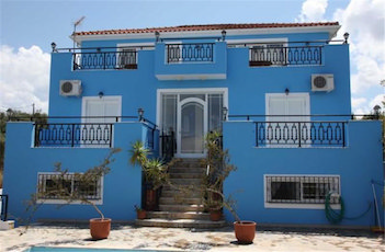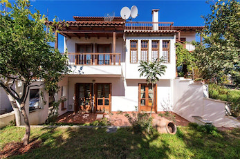 A residential complex provides an uninterrupted view of the Aegean, a private garden, and an energy-efficient fireplace. The property is 1 km from the nearest beach.