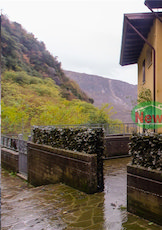 with a picturesque mountain backdrop, this three-floor house features two balconies, a terrace, two bathrooms, and security measures.