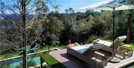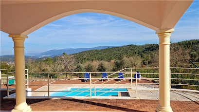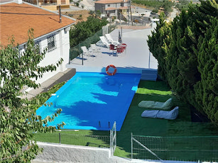This property has spacious rooms, a large garage, multiple terraced areas, a new wood burner, pellet stoves, and a private heated pool. Additional attributes include independent guest accommodation, a fruit tree garden, and solar panels.