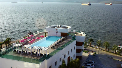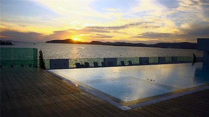 The hotel offers 40 rooms and 96 beds, spread over a sprawling 3200 m2 area. It features a private pier, a spa, a terrace pool with a bar, and has a captivating beach view.